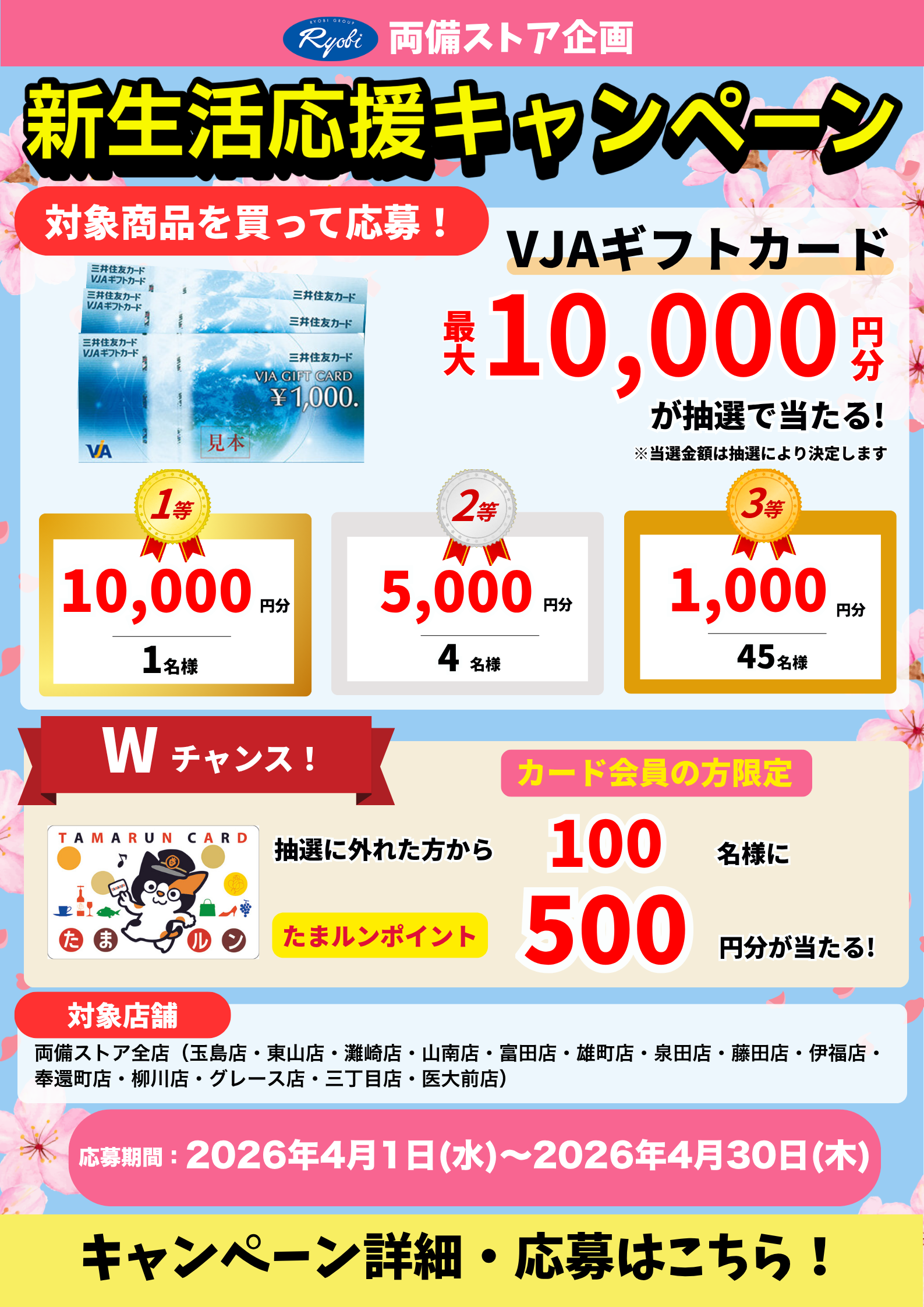 お得な情報 春の新生活応援キャンペーン開催!Xフォロー&リポストキャンペーン開催中【4月】1ヶ月連続超特価 一覧はこちら お知らせ リョービプラッツ灘崎店リニューアルオープン【森のマルシェ 奉還町店】12/5(金)オープン!8月より全店舗にて「ボトルtoボトル」水平リサイクル取り組み開始!2日(土)藤田店でイベントも森のマルシェ医大前店 オープン!両備ストア公式の偽アカウントにご注意ください 一覧はこちら 両備ストア 4つの店舗ブランド 各店舗の個別ページで、最新チラシがご覧いただけます。 店舗情報はこちらから ダブルでお得!Edy付きたまルンカード 200円(税抜)毎に1ポイント貯まる!Edyご利用で200円(税込)毎に さらに +1ポイント! ポイントは1ポイント=1円から使えます! 詳しくはこちらから
