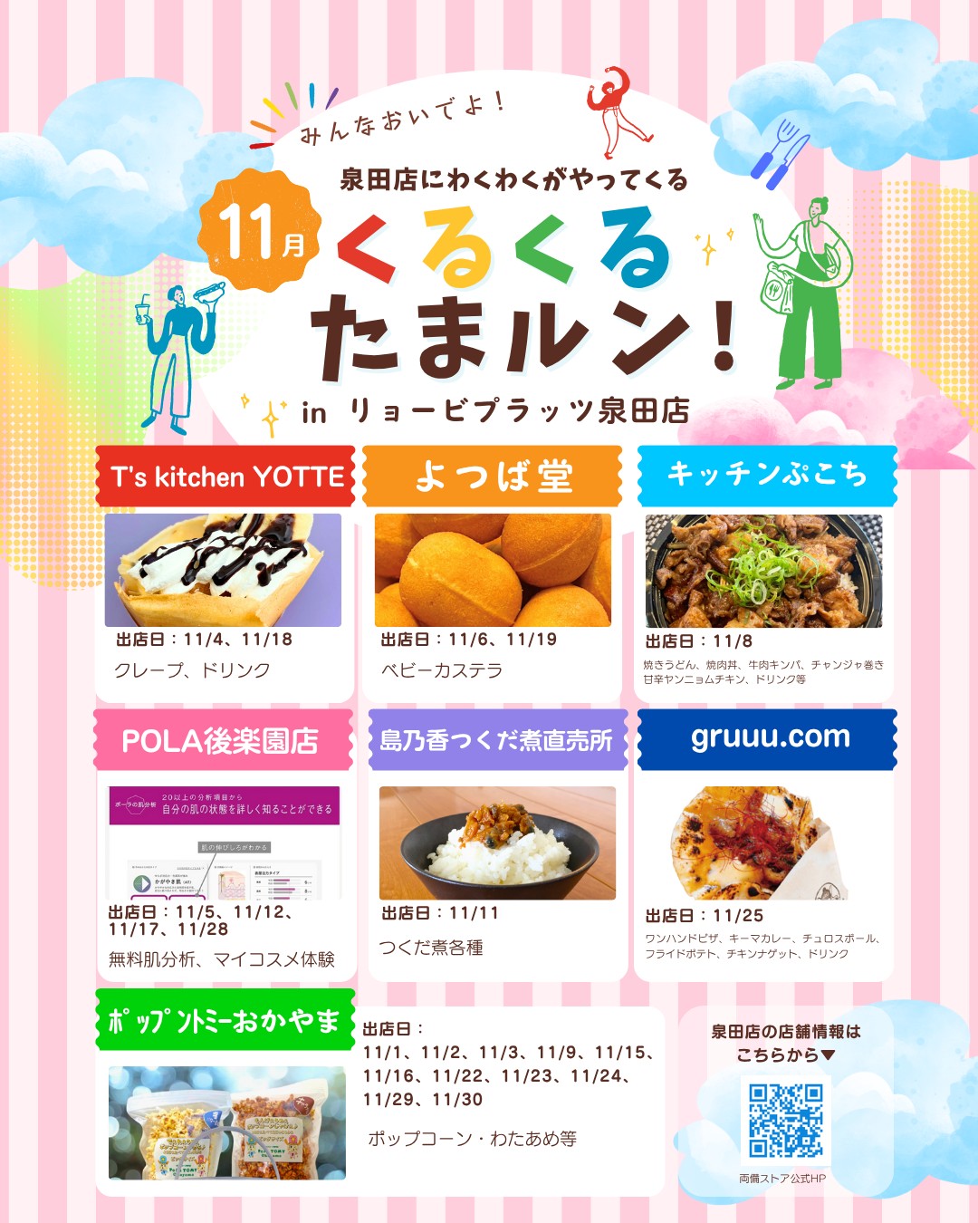 お知らせ2025年10月31日【11月】くるくるたまルン 【イベント予告】11月 くるくるたまルン! リョービプラッツ泉田店にわくわくがやってくる グルメ&ビューティーを気軽に楽しんじゃおう! ■無料駐車場あり◎ カレンダーをチェックして遊びに来てくださいね