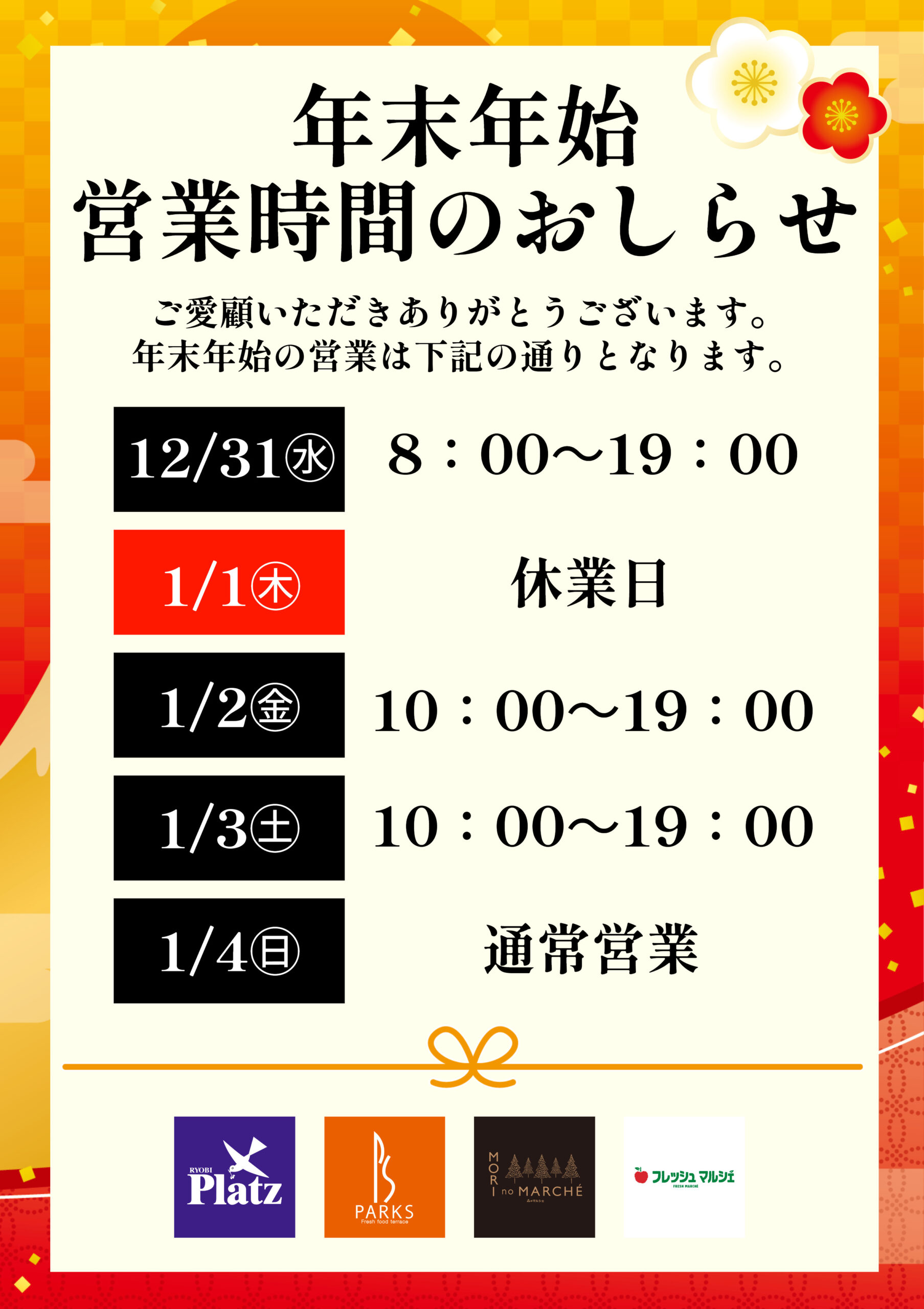 お知らせ2025年12月19日年末年始の営業時間のお知らせ いつも両備ストアをご利用いただきありがとうございます。本年度もたくさんのお客さまにご来店いただき誠にありがとうございました。年末年始の営業につきましてご案内いたします。 ■12/31(水) 8:00~19:00■1/1(木) 休業■1/2(金) 10:00~19:00■1/3(土) 10:00~19:00■1/4(日) 通常営業 2026年度もどうぞよろしくお願いいたします。両備ストア