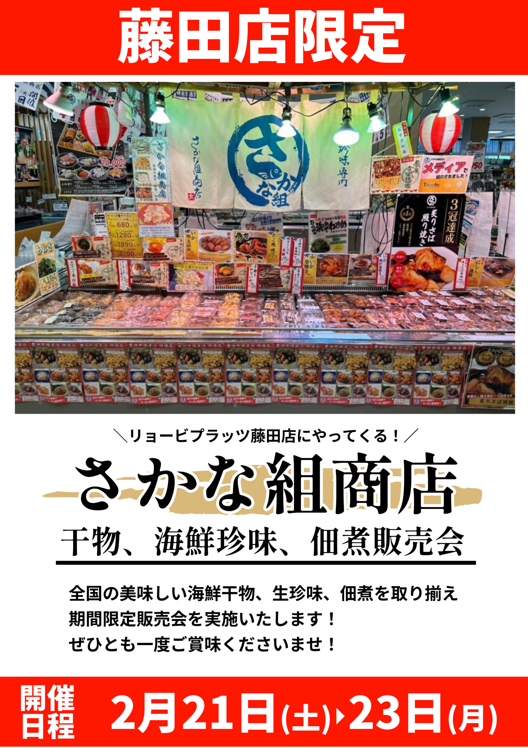 お知らせ2026年1月7日【イベント予告】さかな組商店が藤田店にやってくる! 大好評のさかな組商店がまたまたリョービプラッツ藤田店にやってきます♪ 全国のおいしい干物、海鮮珍味、佃煮を取り揃え期間限定販売会を実施いたします! ■開催店舗:藤田店■開催日:2/21(土)~2/23(月) みなさまのご来店を心よりお待ちしております
